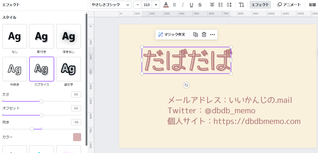 名前の方はエフェクトでスタイル「スプライス」にしてみます。かわいいです。