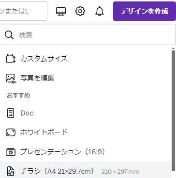 Canvaを開き、「デザインを作成」ボタンからチラシ(A4)を選びます。