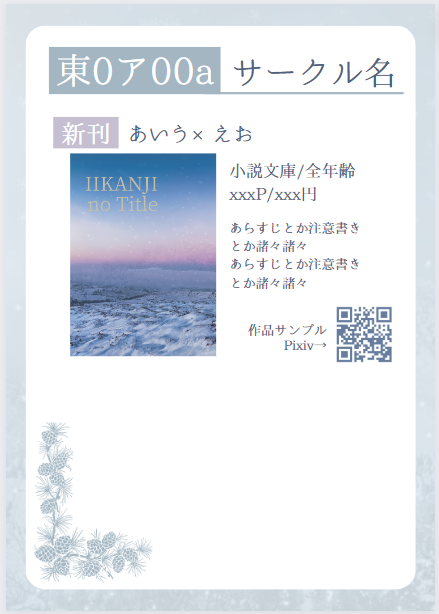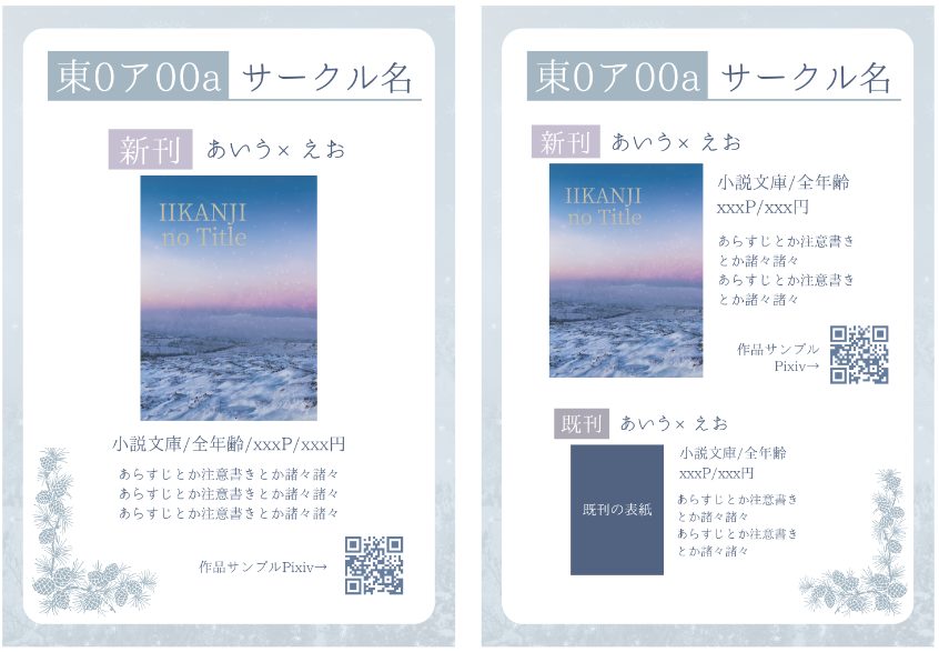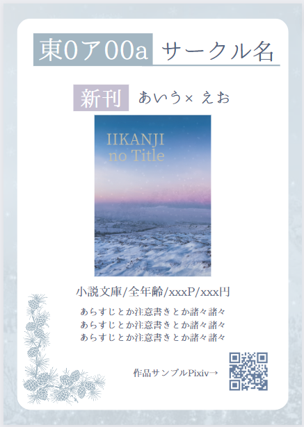 続いて、値段や本のサイズ、ページ数、新刊既刊、内容、成人指定か全年齢かなどを書きましょう。表紙のサイズもバランスを見つつ調整します。