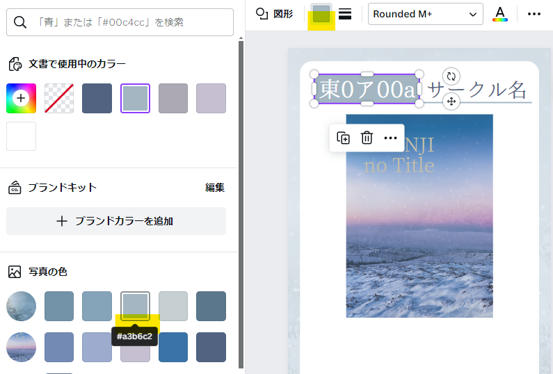 配色についてですが、図形や文字の色は、写真の色というカラーから選ぶと全体に馴染むので便利です。