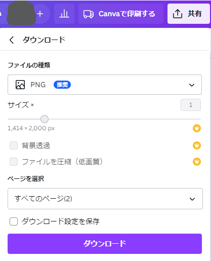 右上の「共有」ボタンから「ダウンロード」、PNGでダウンロードしましょう。