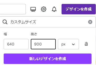 640px×900pxで新しいデザインで作成します。単位は”px”なので注意しましょう。