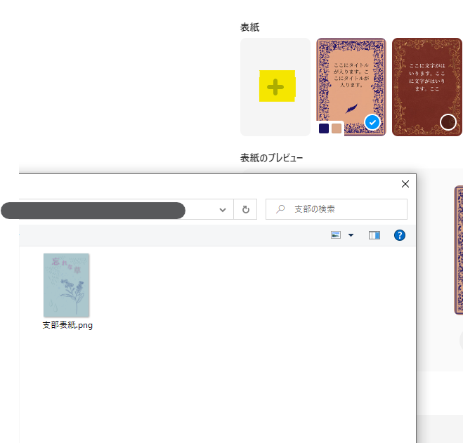 小説投稿画面の表紙の『+』をクリックし、作成したファイルを選択します。